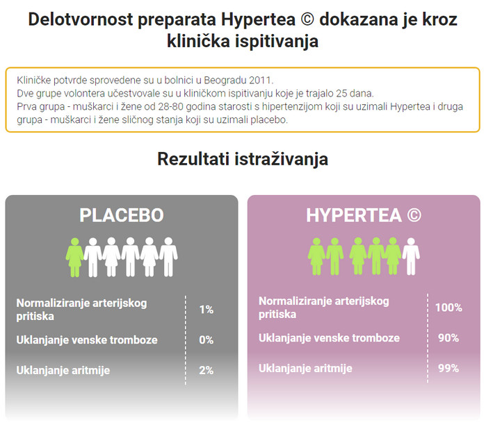Boreći se protiv hipertenzije, osoba može dobiti prilično jake nuspojave koje će imati negativan učinak na njegove vitalne organe. S obzirom na ovu mogućnost, mnogi razmišljaju o tome kako smanjiti količinu lijekova potrebnu za svakodnevnu upotrebu i po mogućnosti izbjeći drugu hipertenzivnu krizu. Dobra pomoć pri rješavanju ovog problema može biti upotreba čajeva ili pića koja smanjuju pritisak. Hypertea – čaj od hipertenzije normalizuje krvni pritisak od prve upotrebe, jedno je od najefikasnijih i najpovoljnijih sredstava, koji se zasniva na ogromnom broju korisnih komponenti koje pozitivno utiču na stanje ljudskog tela.