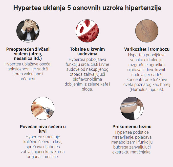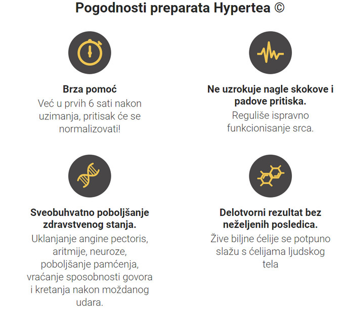 Alat Hypertea pruža visoku efikasnost tretmana zbog svog višesmjernog djelovanja. Nakon ulaska u tijelo, poliaktivne tvari trenutno ublažavaju grč, regulišu rad srca i proširuju lumen krvnih žila, pa se krvni tlak vraća u normalu.